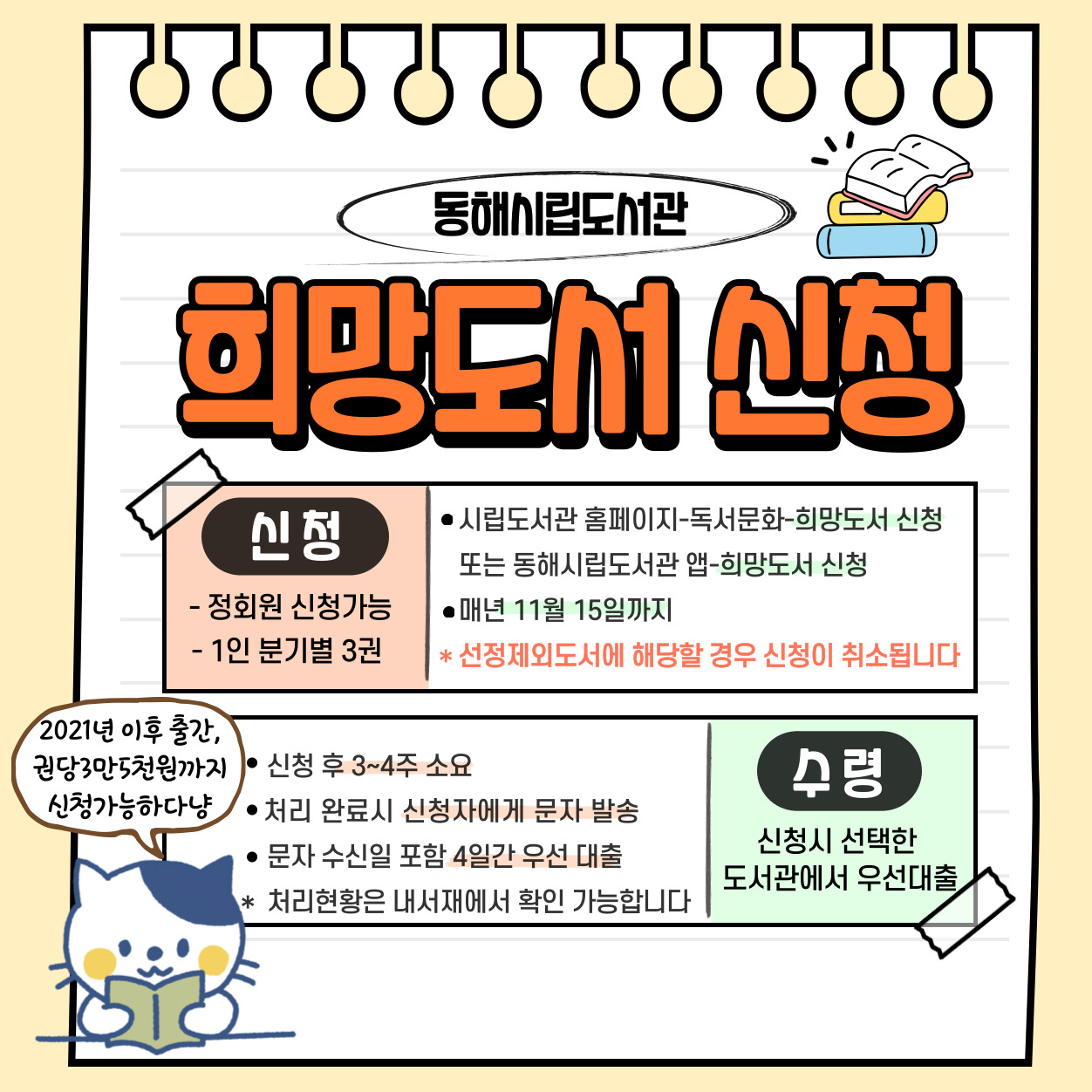 - 희망도서는 발한도서관, 북삼도서관, 꿈빛마루도서관으로 신청 가능합니다(작은도서관 신청 불가)
